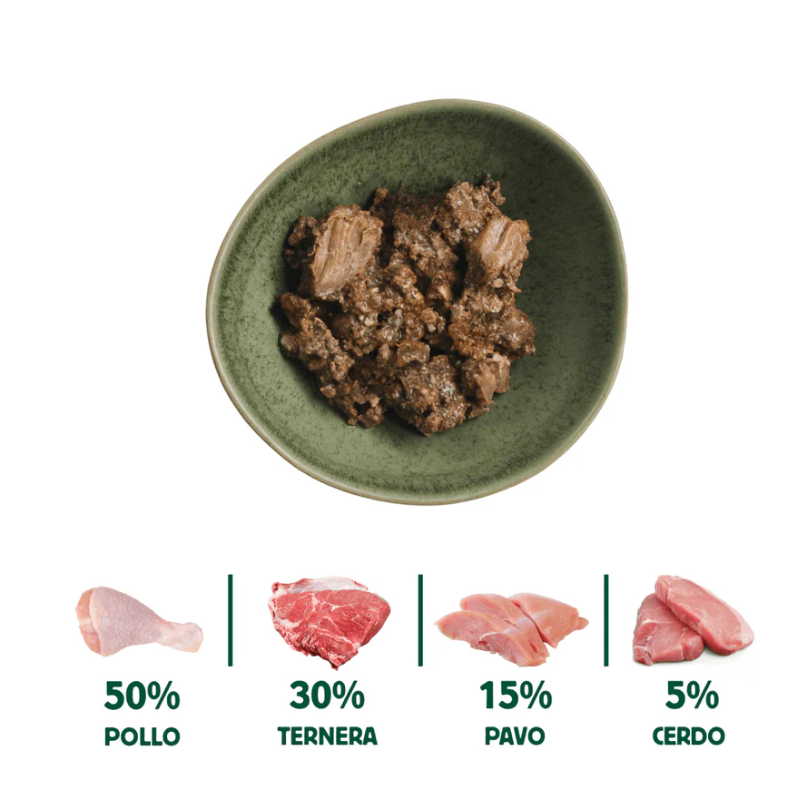 50% Pollo, 30% Ternera (Carne picada, Hígado y Riñón), 15% Pato, 5% Cerdo (Carne picada y Vísceras).