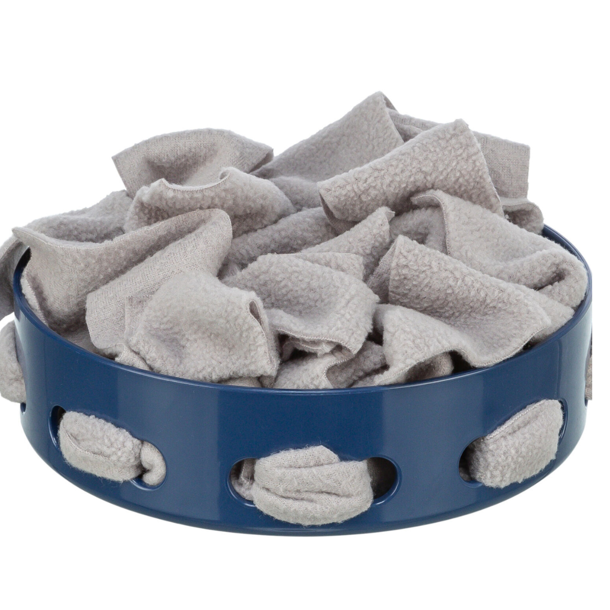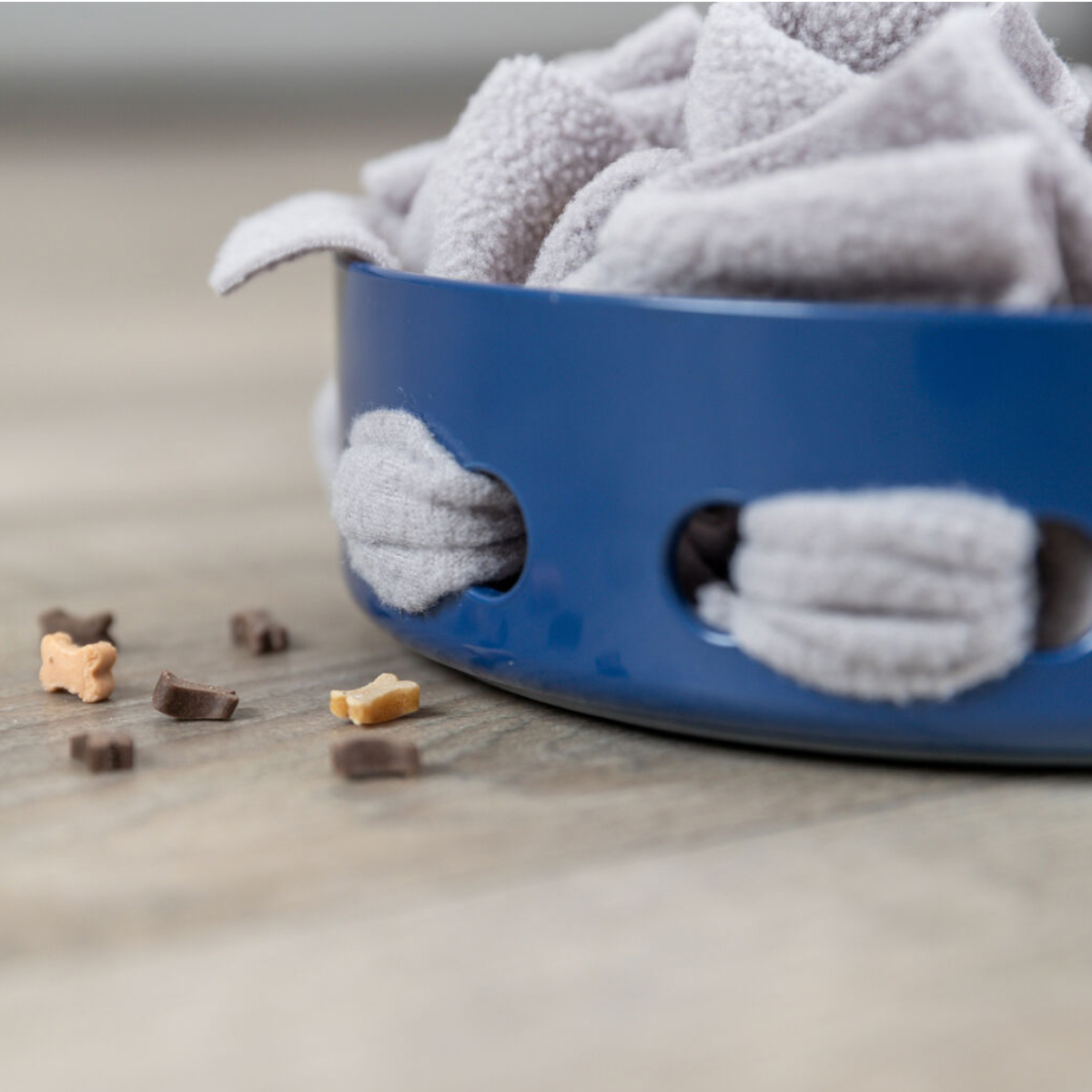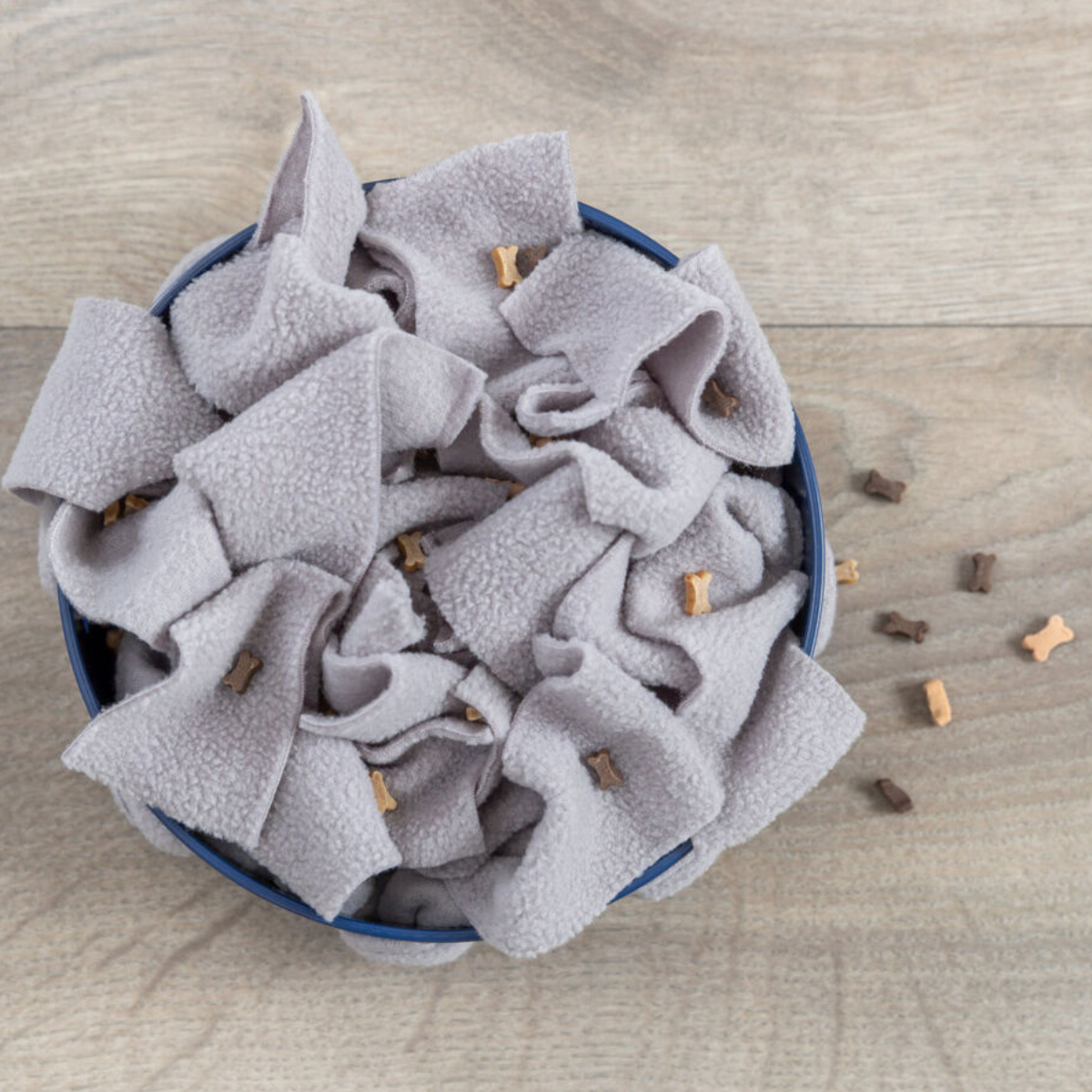 Este comedero olfativo interactivo transforma la rutina de los premios en un juego de inteligencia y olfato. Su diseño con tiras de tela anudadas permite esconder snacks o chuches entre los pliegues, animando al perro a usar el hocico, investigar y resolver el reto de forma natural.