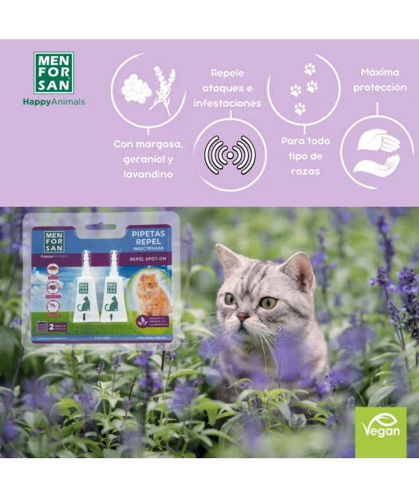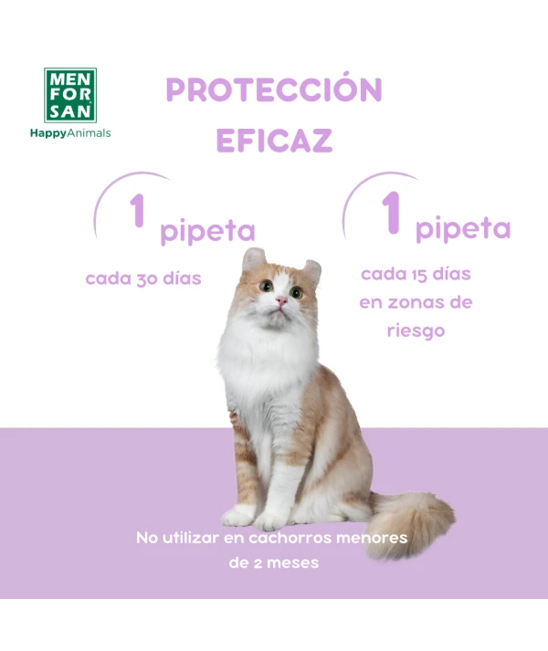 Men For San Pipetas Anti-insectos para Gatos 2 unidades contienen 3 activos repelentes naturales MARGOSA, GERANIOL Y LAVANDINO que protegen de las infestaciones de parásitos externos pulgas, garrapatas, piojos ácaros y también de las picaduras de mosquitos.