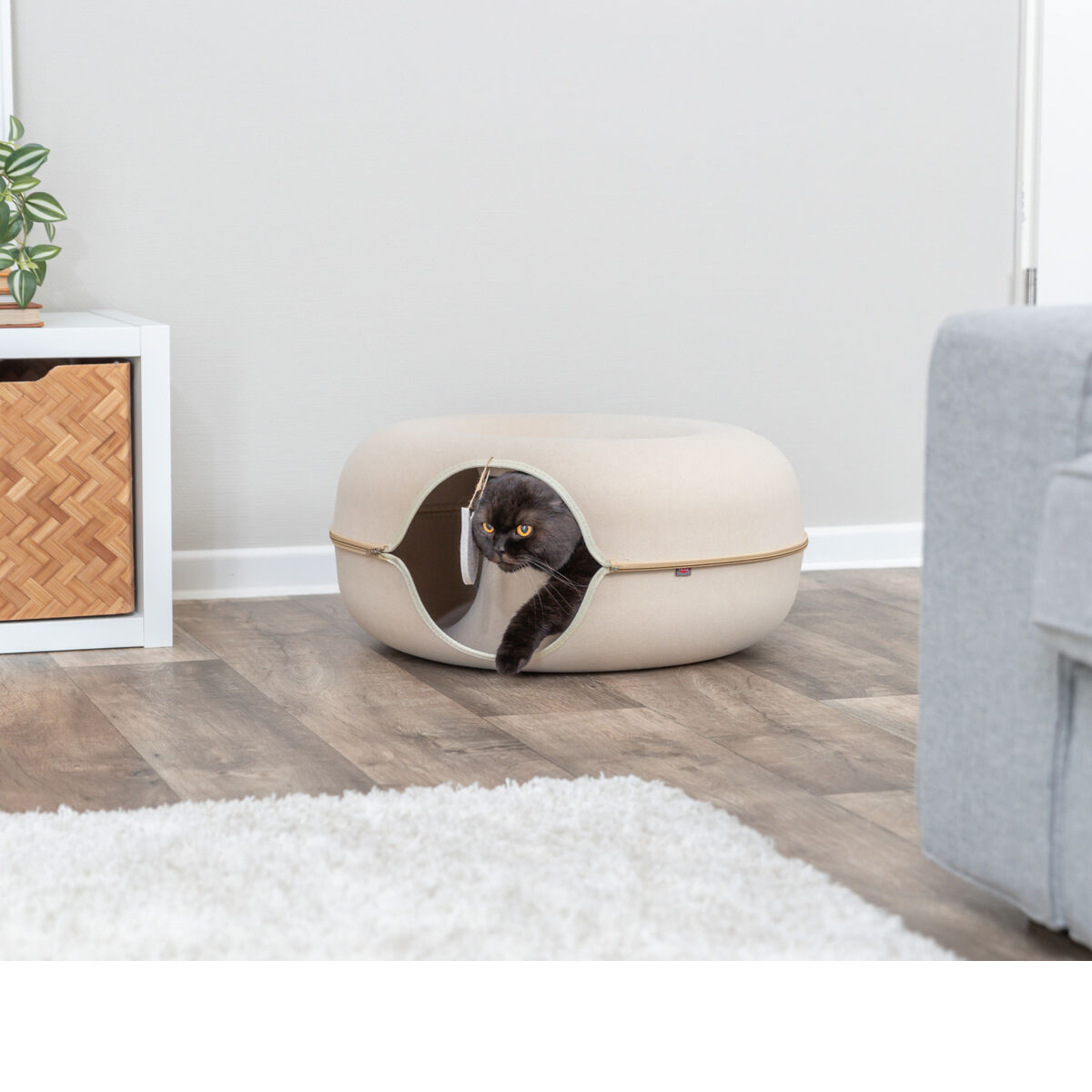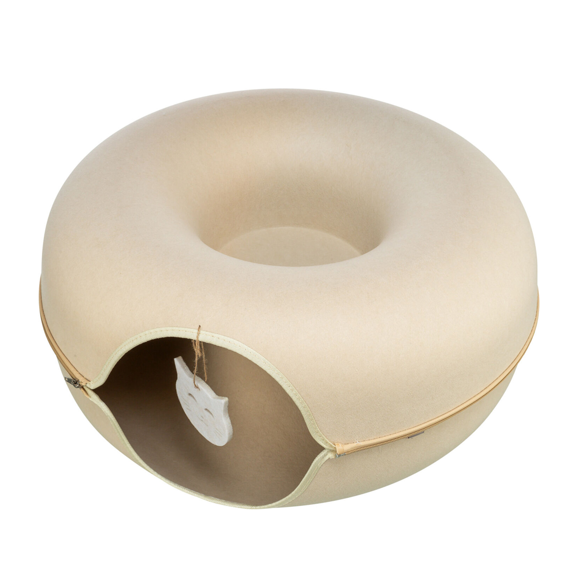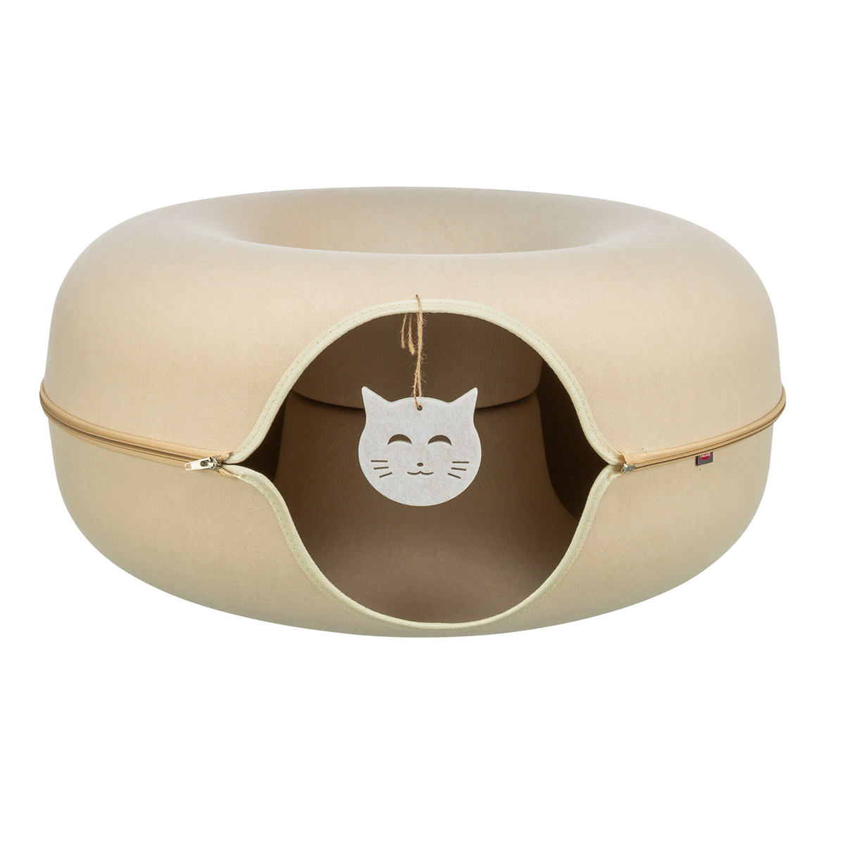 Trixie Cueva Donut de Fieltro a tu gato un refugio acogedor que encaja a la perfección en tu hogar. La forma de fieltro dimensionalmente estable proporciona una agradable estabilidad, mientras que el cojín acolchado con suave funda de felpa invita al gato a acurrucarse en ella.